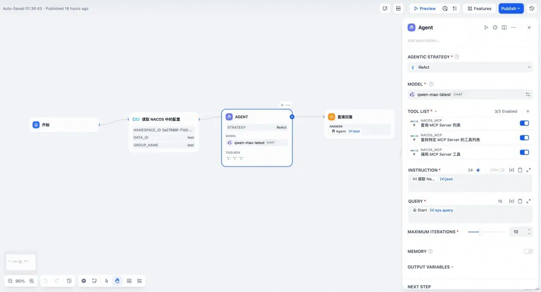 而完成配置之后,在随后的运行时中,Dify 可以实时的感知 Nacos 中注册的 MCP Server 服务,而无需对 Dify 应用进行重新编辑和部署,并根据任务实现对于 MCP 的路由。