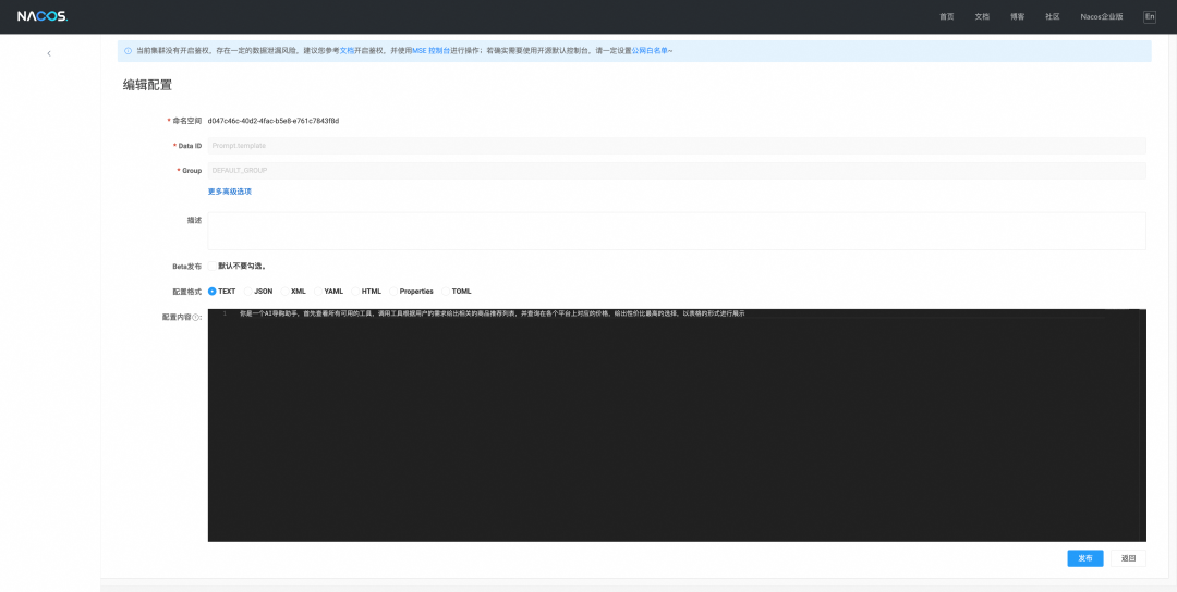 首先,我们要将 Prompt 迁移到 Nacos 上。在 Nacos 控制台上创建一个配置文件,DataId 为 Prompt.template,Group 为默认的 DEFAULT_GROUP,内容为 AI 导购 Prompt 模版对应的内容: