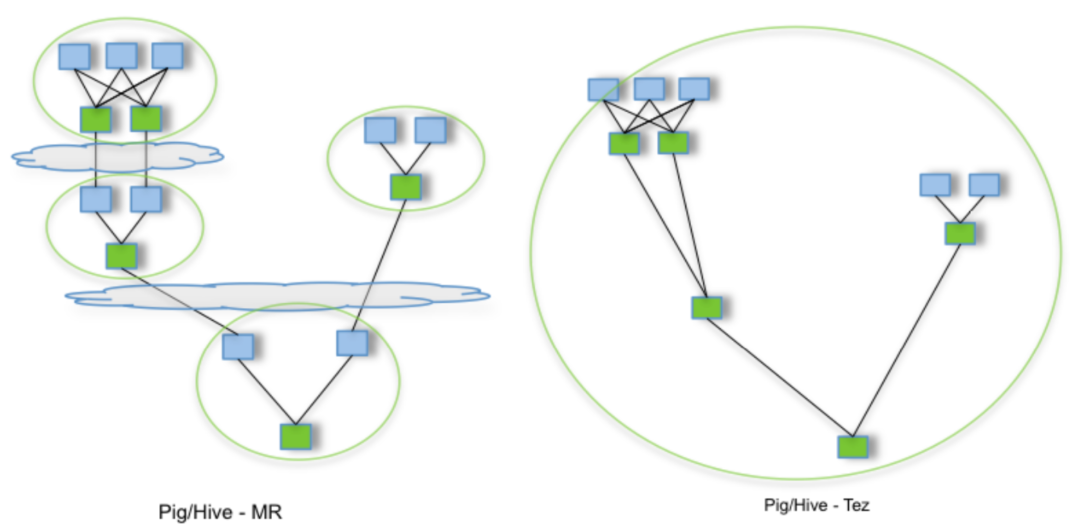 - 复杂查询高效执行:一个复杂的多阶段 Hive SQL 查询可以被编译成一个大的 Tez DAG,在一个 Application 中执行完成,避免了多个 MR Job 串联的开销和中间落盘。