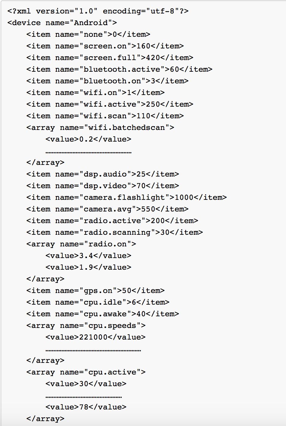 1、各部件单位时耗电:各部件单位时耗电信息保存在power_profile.xml文件中,如下图(以魅族MX6为例):