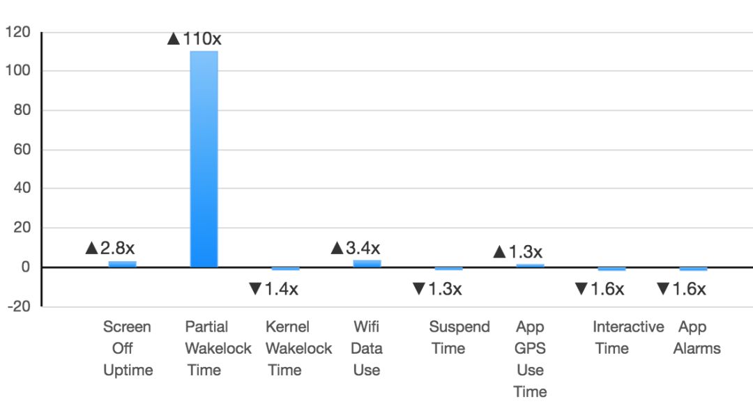 如上图,在一次版本的耗电量测试中发现耗电量显著增加,通过进一步定位发现是应用中引入的某个SDK为了在后台维持心跳使用了wakelock,而在用户将应用切入后台后一直持有没有释放,随后经过跟对应的开发同学沟通进行了优化更改了实现方式去掉了wakelock,耗电量恢复正常。