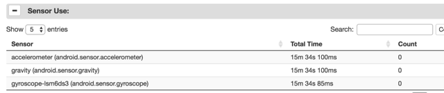 通过前台静默(无任何操作)15分钟,发现耗电量比上个版本高了一倍,如下图: 应用前台静默期间加速度、重力、陀螺仪这三个传感器一直被使用。