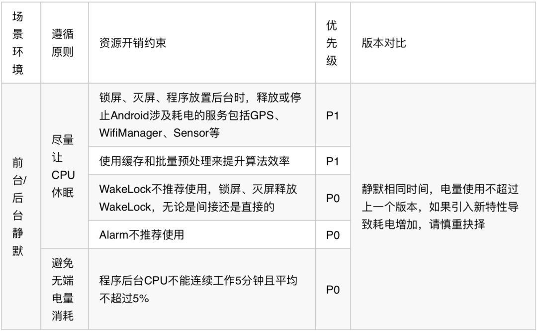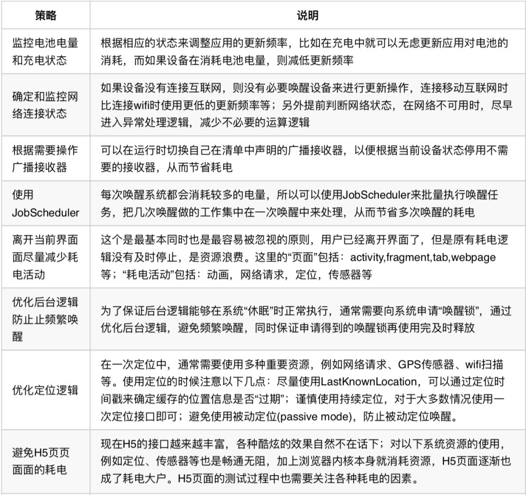 相对于PC来说,移动设备的电池电量是非常有限的,保持持久的续航能力尤为重要。另外,Android的很多特性都比较耗电(如屏幕、GPS、sensor传感器、唤醒机制、CPU、连网等的使用),我们必须要慎重检查APP的电量使用,以免导致用户手机耗电发热,带来不良体验。
