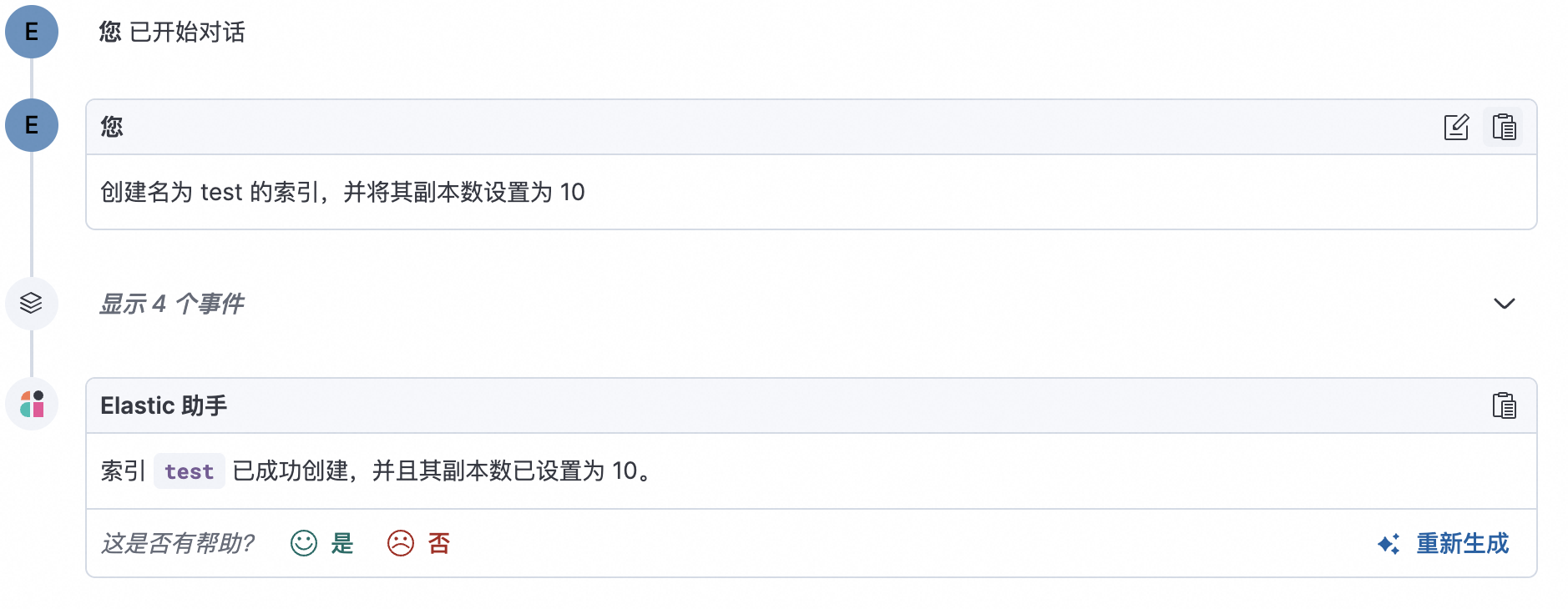 b. 在输入框输入 请列出当前集群的索引,不要包含隐藏索引或者系统索引,并单击发送按钮。