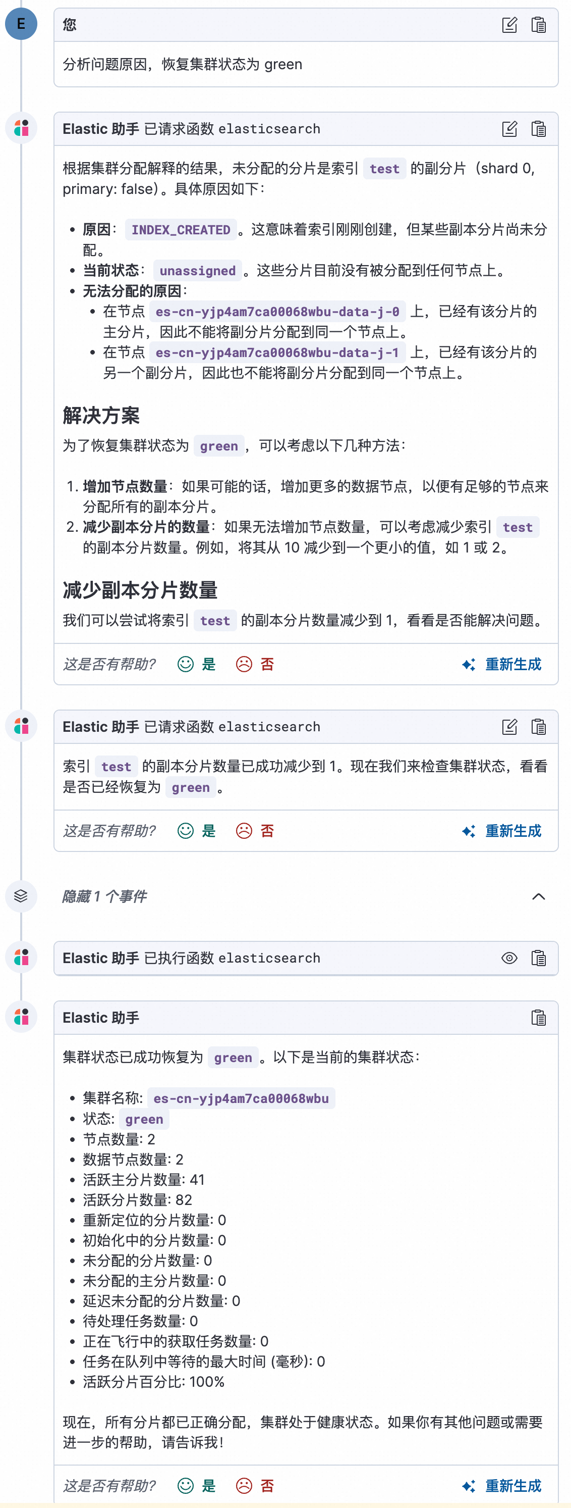 a. 在输入框输入 分析问题原因,恢复集群状态为 green。