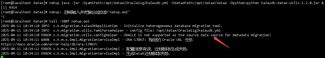 nohup java -jar -DyamlPath=/opt/datax/Oracle11g2kaiwudb.yml -DdataxPath=/opt/datax/datax -Dpython=python kaiwudb-datax-utils-2.2.0.jar &