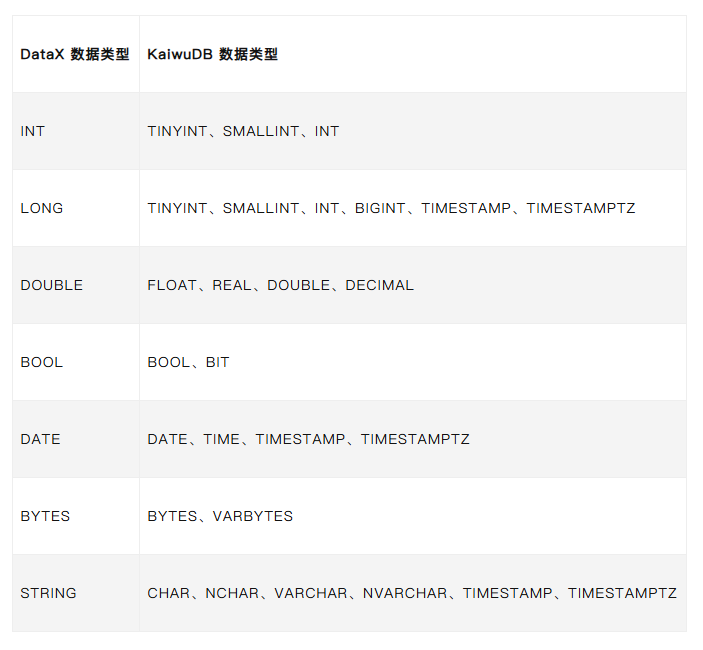 KaiwuDB DataX Utils 支持 DataX 的数据类型。DataX 数据类型与 KaiwuDB 数据类型的映射关系如下表所示: