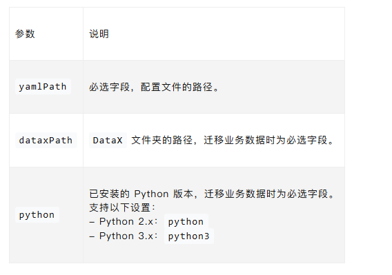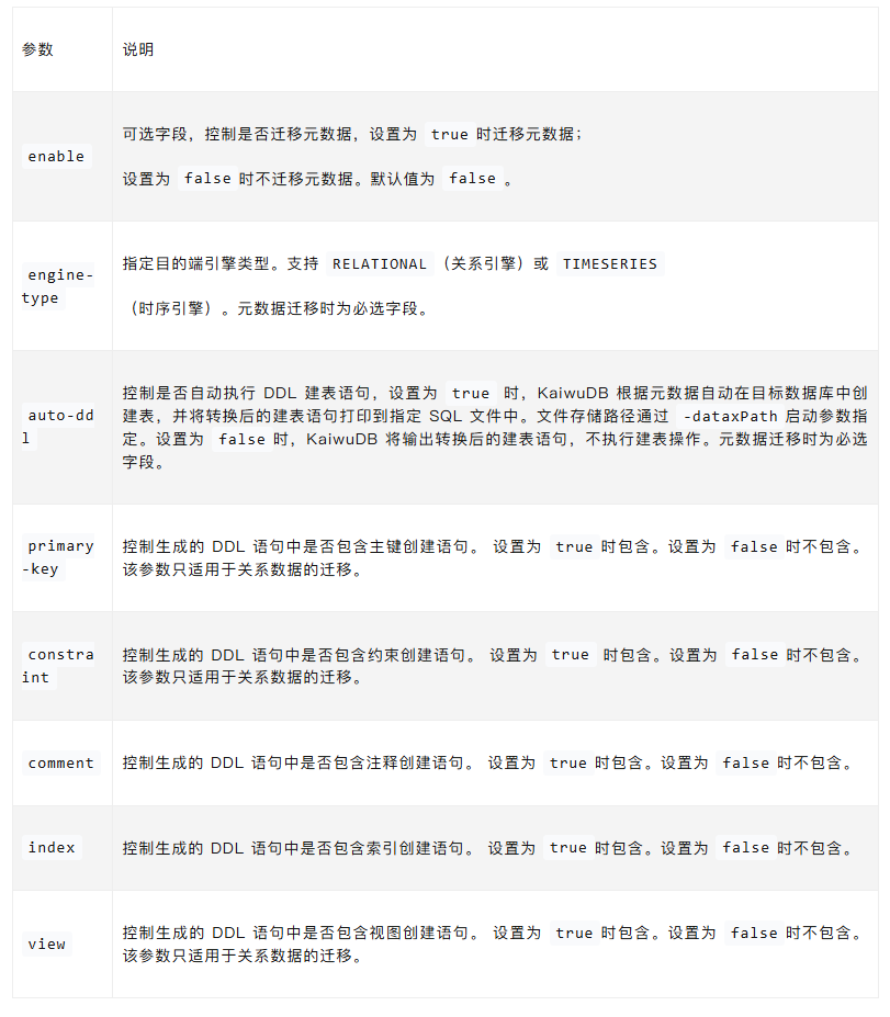 从 KaiwuDB 2.2.0 版本开始,迁移命令不再支持 arguments 参数设置。如果需要设置 JVM 参数以增加内存,可以通过修改 DataX 配置文件来实现。