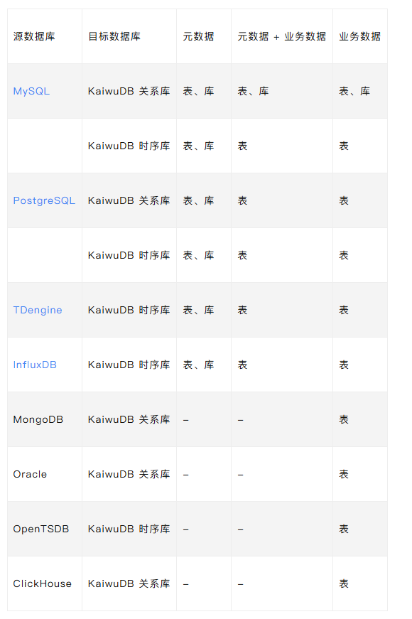 下表列出了 KaiwuDB 支持迁移的异构源数据库和数据迁移方式。