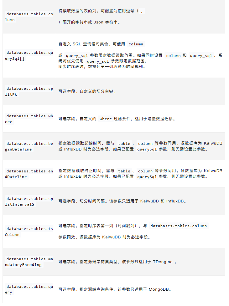 由于目前没有这种类似排除某张表或者某些表、数据类型映射的参数,Oracle迁移到KWDB的配置文件参数不完善,所以日志中有提示读取源端数据库表和列名信息异常,应该是不支持数据类型的提示,比如大字段。所以整库同步前需要将大字段的表整理出来,迁移完成后不在目标端对这些表进行校验或将这些表删除即不迁移这些表。新版本可能会更加完善,使用更加便捷。