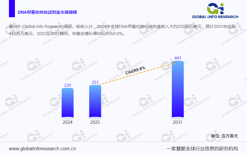 据广州环洋市场信息咨询有限公司(Global Info Research)最新出版的《2025年全球市场DNA甲基化转化试剂盒总体规模、主要生产商、主要地区、产品和应用细分研究报告》内容显示,2024年全球DNA甲基化转化试剂盒市场收入约为230百万美元,预计2031年将增长至443百万美元,2025至2031年年复合增长率(CAGR)为9.8%,市场增速位居分子诊断类试剂前列。