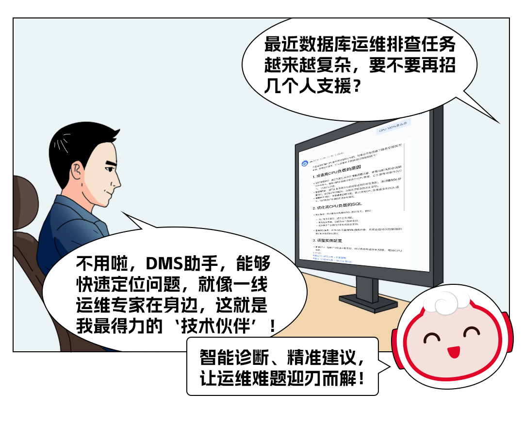 同时,得益于天翼云DMS(数据管理服务)提供性能洞察、一键诊断、请求分析等工具,用户能够快速查看系统各项关键指标,轻松掌握数据库运行状态。智能助手结合DMS的诊断分析工具,不仅提供专家级的诊断建议,还引导用户高效利用这些工具,让故障排查更加直观便捷。即使是经验不足的运维人员,也能快速上手,显著提升问题解决效率。