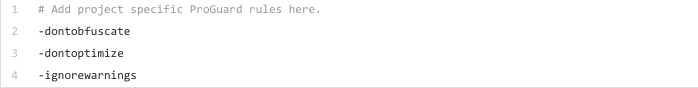 用于调试构建的Proguard规则必须具有以下行以强制proguard忽略警告,跳过代码混淆和优化: