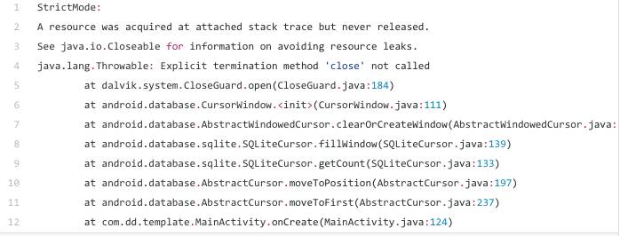 这里是当你忘记关闭SQLiteCursor的日志的例子: