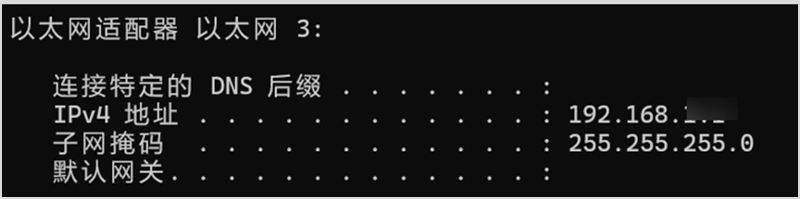 在键盘上使用快捷键“Win+R”,在运行窗口输入 cmd 进入命令行窗口。输入 ipconfig 命令查询 PC 网口 IP 地址是否修改成功: