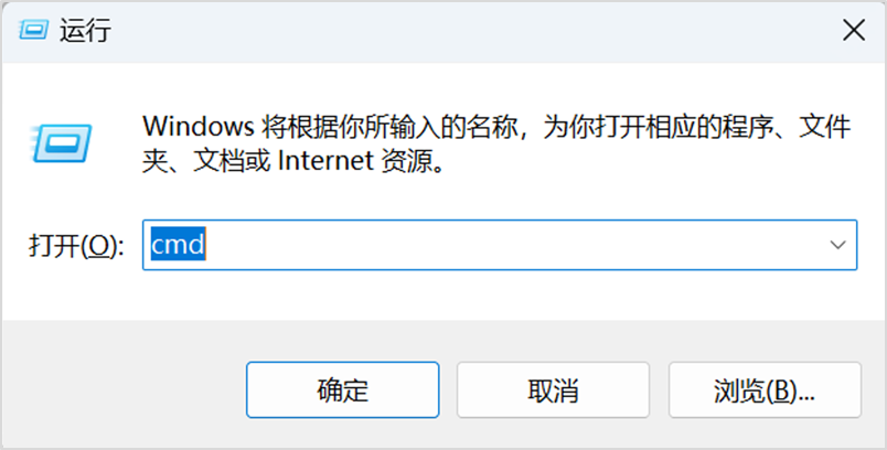 在键盘上使用快捷键“Win+R”,在运行窗口输入 cmd 进入命令行窗口。