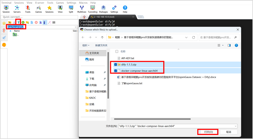 将下载的文件 dify-1.1.3.zip、docker-compose-linux-aarch64 上传至/usr/local/dify 目录。