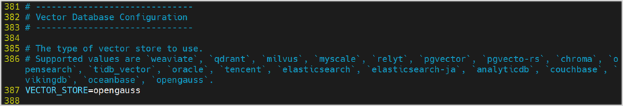 按 i 进入插入模式,修改对应 387 行,将 VECTOR_STORE 的值改为 opengauss,如下图。