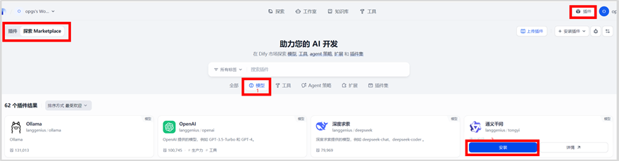 右上角点击“插件”-“探索 Marketplace”-“模型”下载导入模型的插件(以通义千问为例)-安装插件(通义千问)。