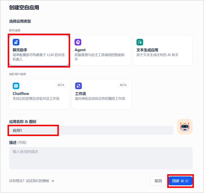 创建聊天助手,填写应用名,然后点击“创建”按钮。
