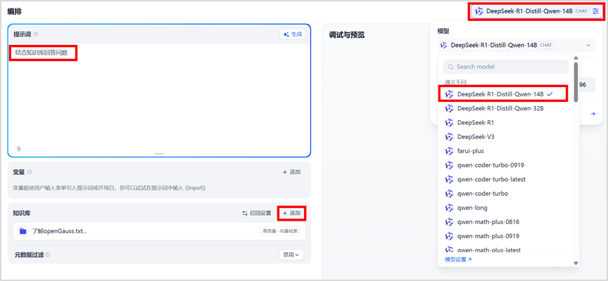 配置模型,先设置提示词“结合知识库回答问题”,并导入知识库。