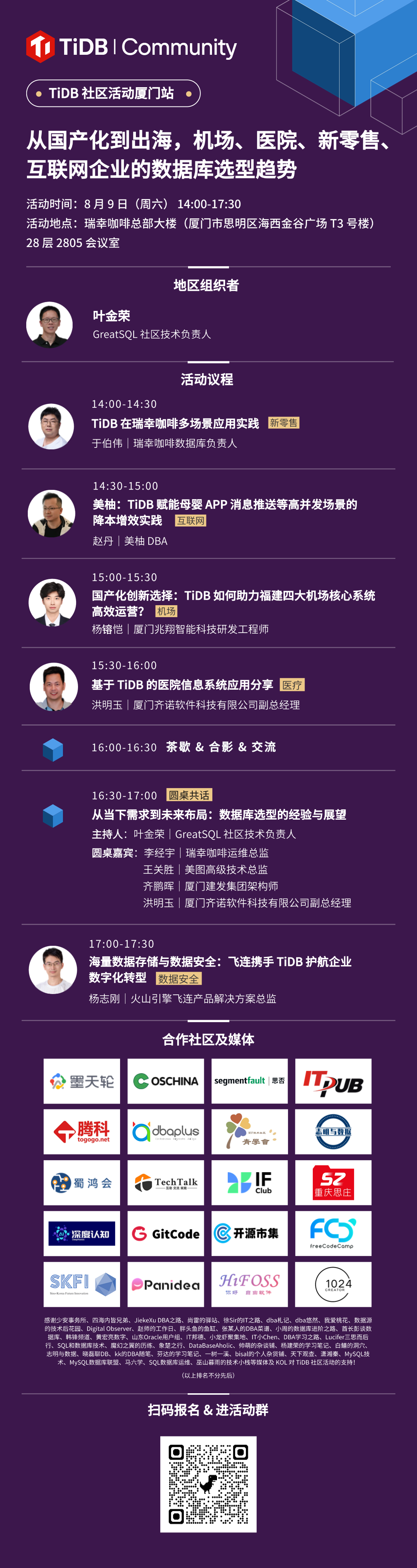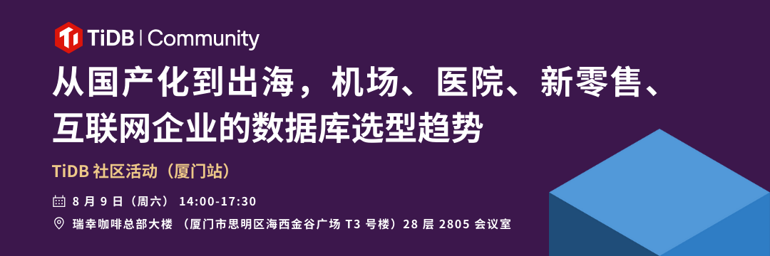 🔥 TiDB 社区活动厦门站来啦,8 月 9 日,一起聚焦“从国产化到出海”的数据库选型风向!