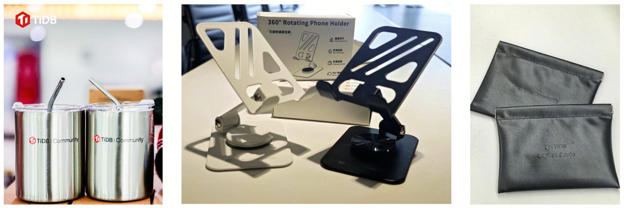 2. 线下参会即可获得伴手礼:TiDB 工业风咖啡杯/ 360度金属手机支架/超实用皮质收纳袋三选一