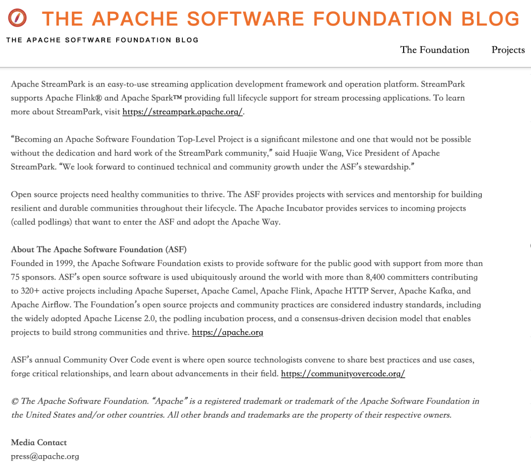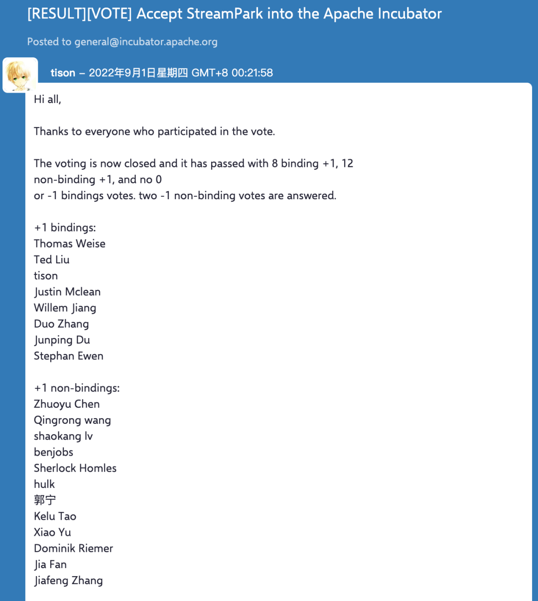 接下来的一个月里,我马不停蹄地准备项目改名、编写捐赠提案、签署 CLA、参与孵化器讨论、组织社区投票... 终于在导师和团队多方共同努力下,项目于 9 月 1 日以 StreamPark 新名字成功进入 Apache 孵化器,标志着项目发展进入新阶段。