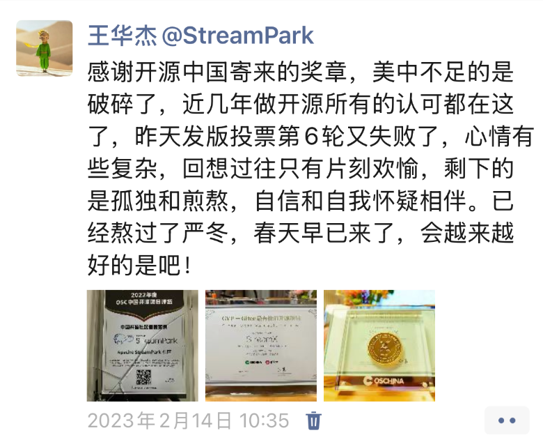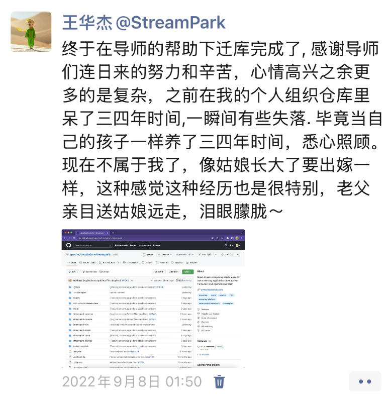 至今仍清晰记得 2022 年 9 月 8 日凌晨,在导师和 Apache 工作人员的协助下,项目终于从我的个人仓库正式迁移到 Apache 组织。那一刻,所有的压力、辛酸、感动和失落一起涌上心头,眼泪再也止不住,随后我在朋友圈写下了这样一段话: