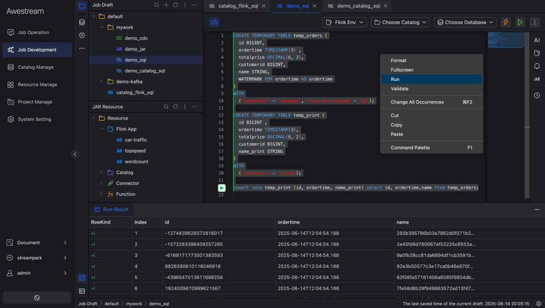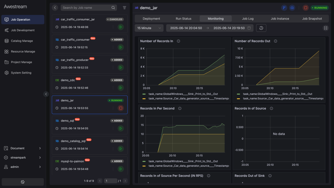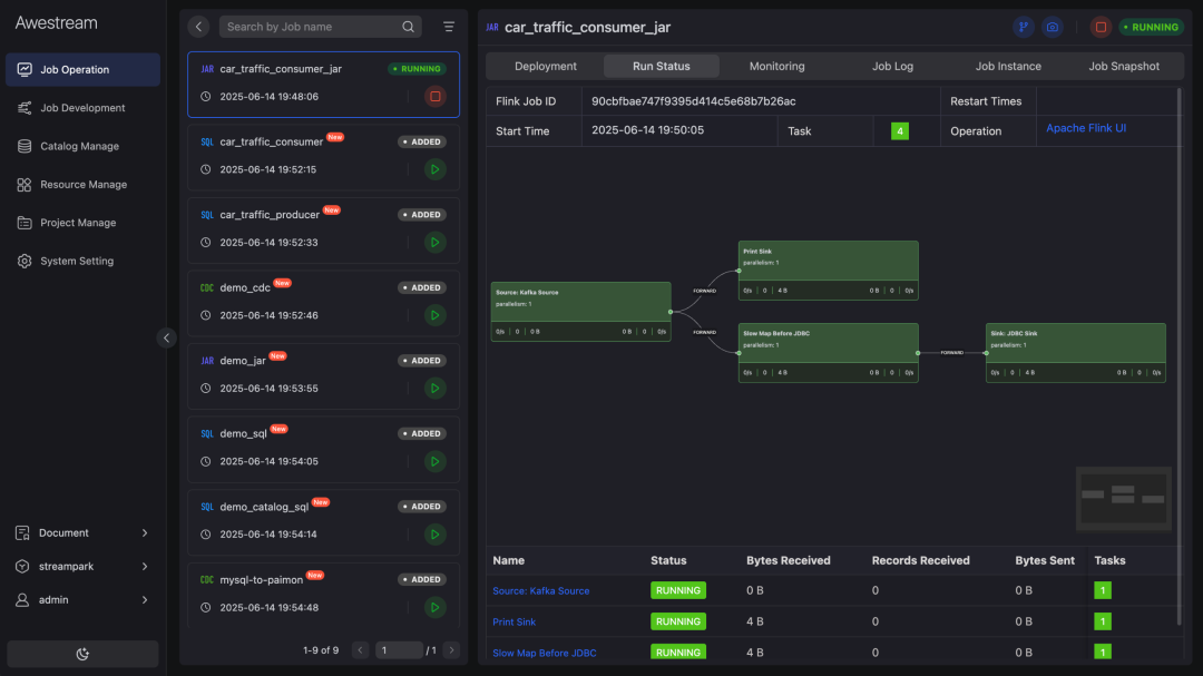 数据同步与迁移虽是常见需求,但高效、低门槛的实现方式才是核心竞争力。Awestream 深度集成 Flink CDC 3.x,原生支持 MySQL、Oracle、MongoDB、OceanBase、Doris、Paimon 等数十种数据源的实时同步,真正做到零编码 —— 只需选择源库与目标库,填写简单的 CDC YAML 配置,即可在 3 分钟内 完成一条高性能数据管道的搭建,并一键部署至 Standalone / YARN / Kubernetes 任意集群,大幅降低实时数据迁移的技术门槛与运维成本。
