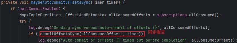 同步提交发生于KafkaConsumer类close方法,调用ConsumerCoordinator类close方法,调用maybeAutoCommitOffsetsSync方法,调用commitOffsetsSync方法实现同步提交,如图所示: