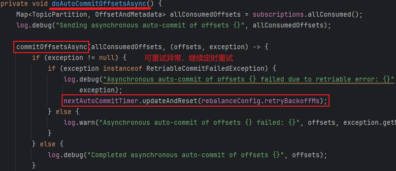 而异步提交发生于KafkaConsumer类poll方法,调用updateAssignmentMetadataIfNeeded方法,调用ConsumerCoordibator类poll方法,调用maybeAutoCommitOffsetsAsync方法,调用doAutoCommitOffsetsAsync方法,调用commitOffsetsAsync方法实现异步提交,如果遇到可重试异常,定时休眠重试,如图所示:
