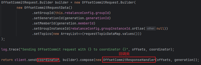 最终,sendOffsetCommitRequest方法将offset发送给指定服务端coordinator,并设置回调类OffsetCommitResponseHandler用来解析服务端处理请求之后返回的结果,如图所示: