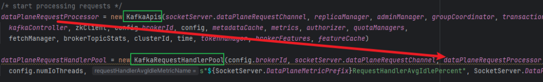 进程启动入口KafkaServer类startup方法会实例化KafkaApis类和KafkaRequestHandlerPool类,如图所示: