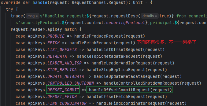 KafkaApis类继承自ApiRequestHandler其实就是producer、consumer与broke之间各种请求的接收处理方法,而KafkaRequestHandlerPool是用于执行这些处理方法的线程池。KafkaApis将各种请求映射到对应的处理方法,包括但不限于PRODUCE(写)、FETCH(读)、OFFSET_COMMIT(提交offset)等,如图所示: