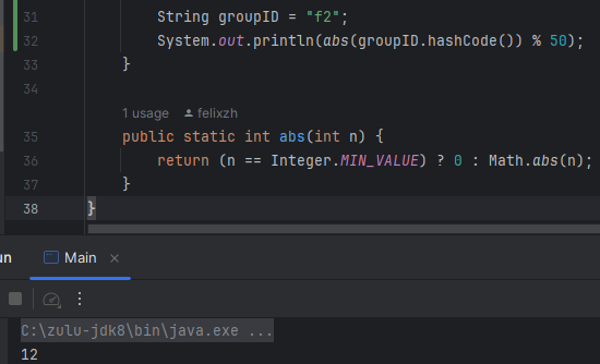 消费者offset提交到Kafka存储在__consumer_offset主题的单一分区,分区号的计算逻辑笔者从源码摘出来,执行结果如图所示: