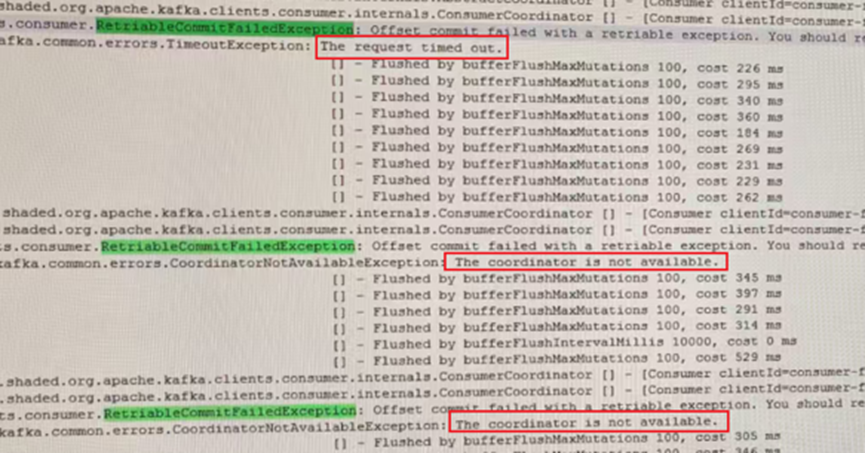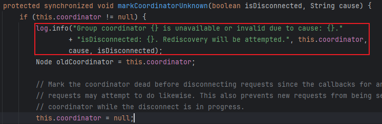 说明:offset提交超时之后,进入到重试,一直重复一直报错:The coordinator is not availabled,对应于COORDINATOR_NOT_AVAILABLE,属于RetriableException可重试异常。虽然一直重复报错与现场相同,但是现场没有offset提交超时异常,不过可以肯定的是根据现场日志显示,确实进入markCoordinatorUnknown方法,如图所示: