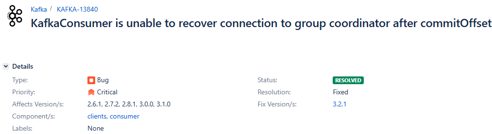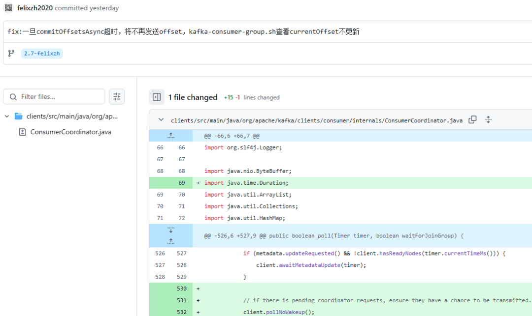 问题明确:异步提交失败导致进入重试但是存在bug一直重试失败,而同步提交是成功的!那么,对比异步提交方法commitOffsetsAsync和同步提交方法commitOffsetsSync,不难发现,commitOffsetsAsync重试时缺少coordinator可用的处理逻辑。检索发现社区有个类似问题,影响版本为2.6.1, 2.7.2, 2.8.1, 3.0.0, 3.1.0,修复版本为3.2.1: