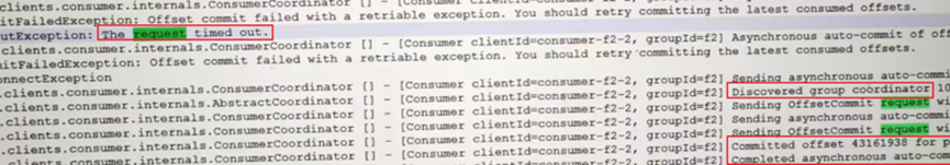 如上图所示:遇到offset提交超时之后,寻找coordinator,重试提交offset成功!