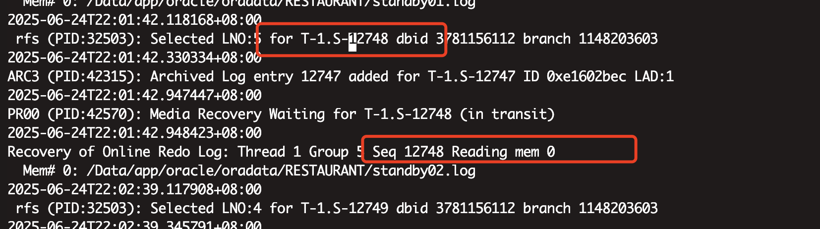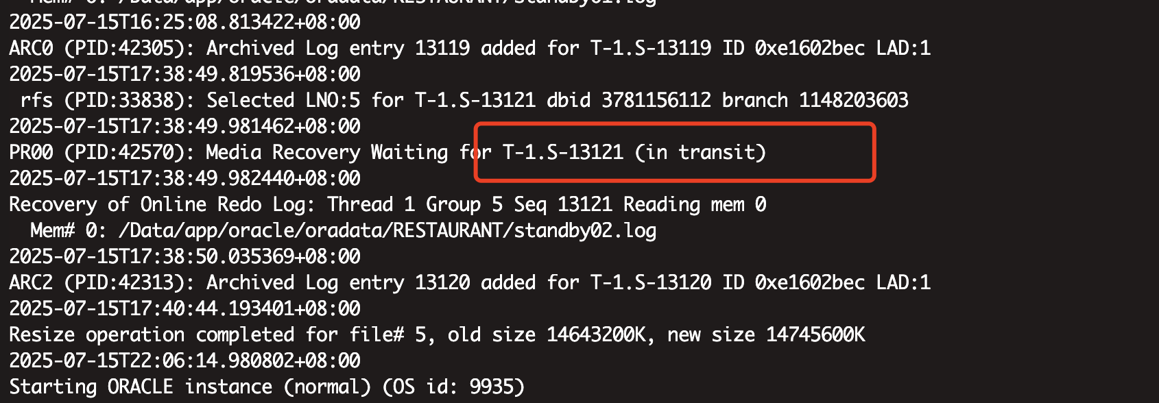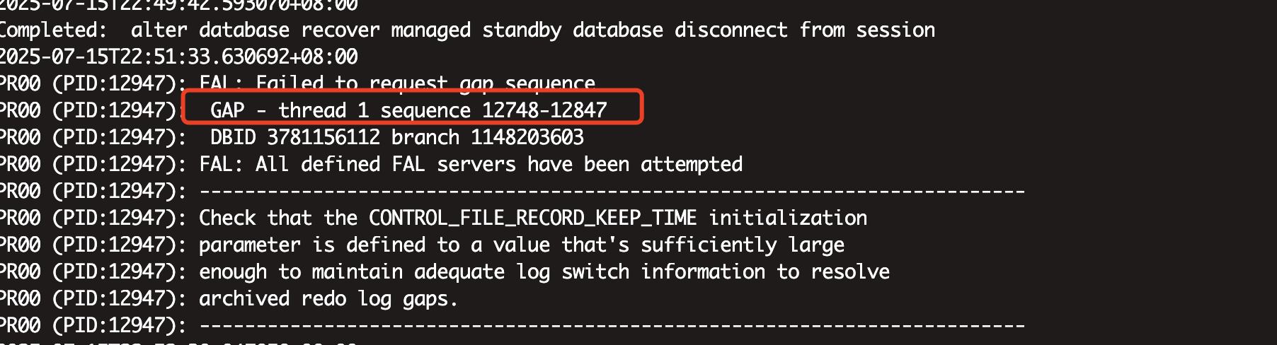 有一套19.3环境的备库意外断电,数据库重启到mount状态无法进行open,提示有gap,需要12748~12847的归档日志