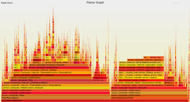 这些函数堆栈高度在火焰图中连续升高,形成“平台状火焰墙”,说明系统在反复执行 filter 和 take,并频繁进行内存构建操作。
