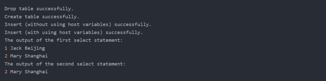 #include <stdio.h>EXEC SQL define NAME_LEN 20;EXEC SQL define ADDRESS_LEN 200;main(){EXEC SQL BEGIN DECLARE SECTION;int rnum;int snum;char sname[NAME_LEN + 1];char saddress[ADDRESS_LEN + 1];EXEC SQL END DECLARE SECTION;EXEC SQL WHENEVER ERROR STOP;EXEC SQL connect to 'testzh';// Drop tableEXEC SQL drop table if exists tab2;printf("Drop table successfully.\n\n");// Create tableEXEC SQL create table tab2 (num int, name char(20), address varchar2(200));printf("Create table successfully.\n\n");// Insert without using host variablesEXEC SQL insert into tab2 values (1, "Jack", "Beijing");printf("Insert (without using host variables) successfully.\n\n");// Insert using host variablessnum = 2;sprintf(sname, "Mary");sprintf(saddress, "Shanghai");EXEC SQL insert into tab2 values (:snum, :sname, :saddress);printf("Insert (with using host variables) successfully.\n\n");// Use a static SQL statement to select dataEXEC SQL declare mycursor1 cursor forselect num, name, address from tab2;EXEC SQL open mycursor1;printf("The output of the first select statement:\n");for (;;){EXEC SQL fetch mycursor1 into :snum, :sname, :saddress;if (strncmp(SQLSTATE, "00", 2) != 0)break;printf("%d %s %s\n", snum, sname, saddress);}if (strncmp(SQLSTATE, "02", 2) != 0)printf("SQLSTATE after fetch is %s\n", SQLSTATE);EXEC SQL close mycursor1;EXEC SQL free mycursor1;// Use a dynamic SQL statement to select dataEXEC SQL prepare mystmt from "select num, name, address from tab2 where num = ?";EXEC SQL declare mycursor2 cursor for mystmt;rnum = 2;EXEC SQL open mycursor2 using :rnum;printf("\nThe output of the second select statement:\n");for (;;){EXEC SQL fetch mycursor2 into :snum, :sname, :saddress;if (strncmp(SQLSTATE, "00", 2) != 0)break;printf("%d %s %s\n", snum, sname, saddress);}if (strncmp(SQLSTATE, "02", 2) != 0)printf("SQLSTATE after fetch is %s\n", SQLSTATE);EXEC SQL close mycursor2;EXEC SQL free mystmt;EXEC SQL free mycursor2;EXEC SQL disconnect current;exit(0);}