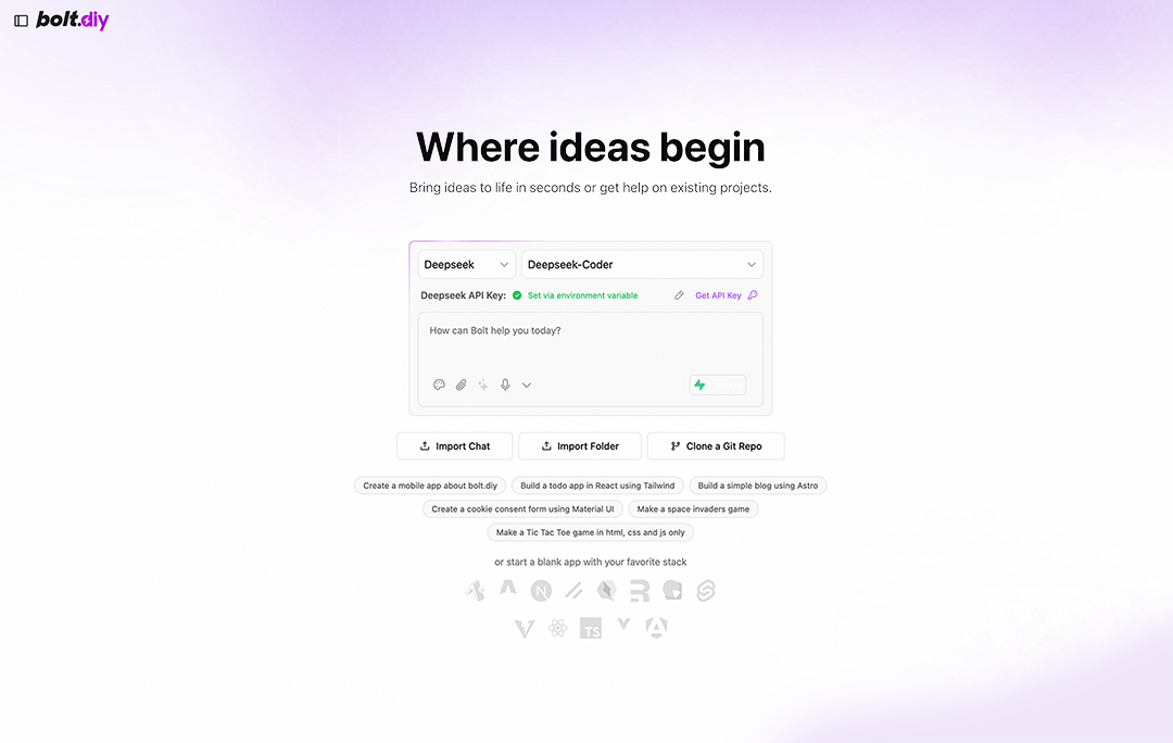 OK,启动后您将看到专属于自己的vibe coding应用页面。随后,我们可以选择一个大模型并填入对应的API Key,比如这里我们选择Deepseek的编码模型。接下来就可以愉快地vibe coding了。