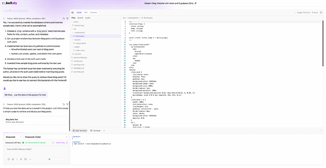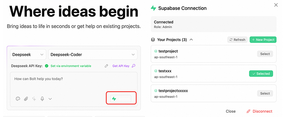 配置完成后您就可以在Bolt.diy的界面上看到您的Supabase项目了。