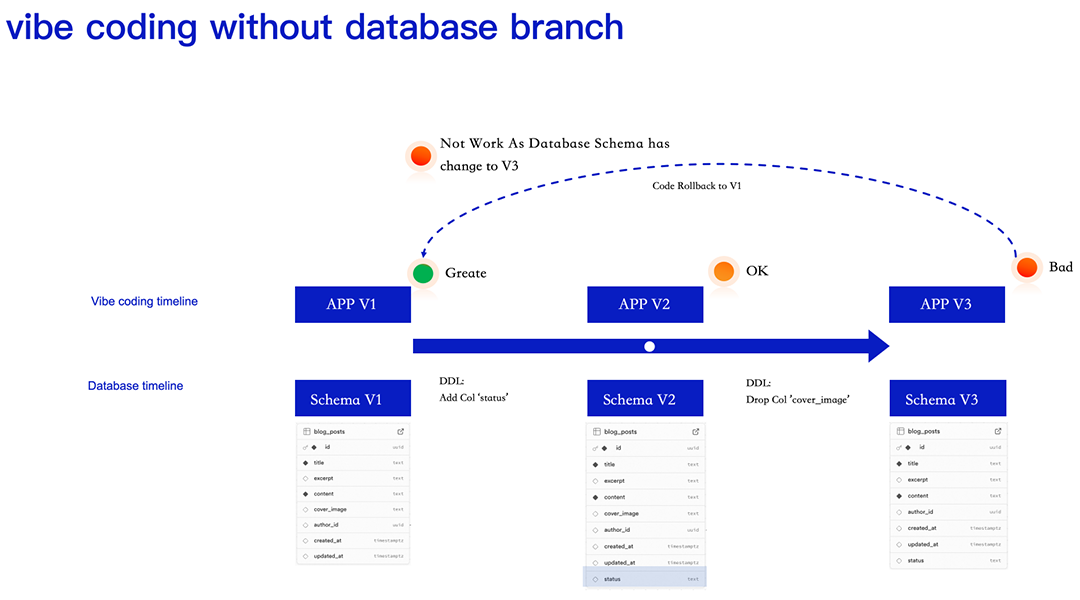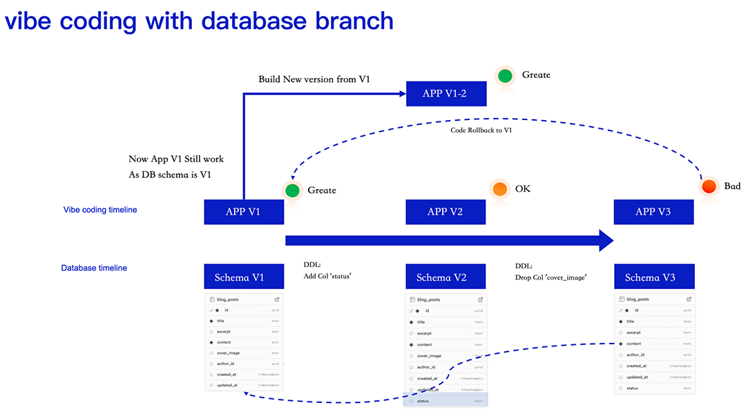 虽然当下大模型的能力已十分强大,但完全交由大模型进行编码,依然存在风险,尤其是上大模型进行后端操作时,甚至可能会出现删库删表等高危操作。而AnalyticDB PostgreSQL版提供的Branch能力,可以让用户和使用版本管理工具git一样使用数据库。提供vibe coding的安全和容错能力。