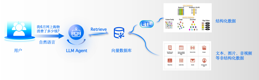 然而,借助向量数据库将相关数据转化为向量并进行存储后,用户只需以自然语言的形式向Agent应用发出查询指令,例如直接询问 “我 6 月份网上消费花了多少钱”,Agent应用便能够迅速从向量数据库中检索出用户的背景数据,并结合模型的推理能力,为用户提供更精准、更便捷的答案。