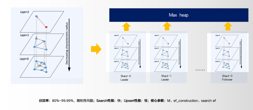 HNSW索引是一种基于内存图结构的高效索引,它通过构建多层图来实现快速的相似性搜索。然而,传统的HNSW索引在面对大规模数据量时,可能会面临插入效率下降、删除操作导致的图重组开销增大以及过滤条件带来的性能瓶颈等问题。