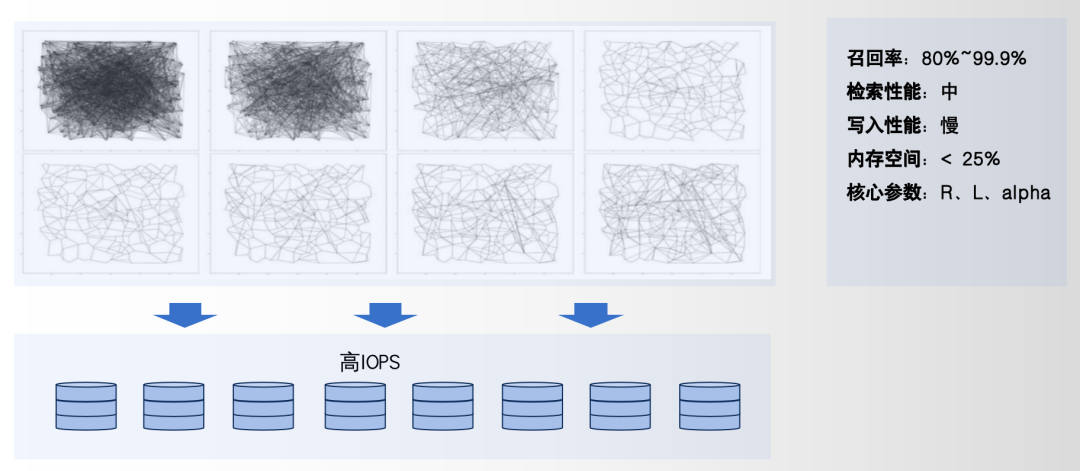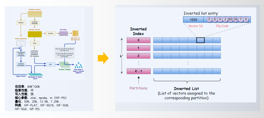 IVF系列:基于聚类,适用于超大规模(亿级+)。写入快,通过量化(PQ等)可降低存储成本50%-75%。召回率80%-100%。