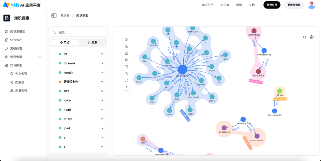 悦数 AI 应用平台基于 Graph RAG 技术,将图数据库与生成式 AI 融合,可显著提升大模型在复杂场景中的精准度与可靠性,有效缓解大模型“幻觉”问题。通过构建动态知识图谱,平台能够高效管理文档层级与复杂关系,支持从文件夹到段落的全链路知识关联。结合“元知识频谱”与“增强图频谱”技术,悦数 AI 应用平台为金融风控、政务决策等高复杂度场景提供可解释、可追溯的智能决策支持。