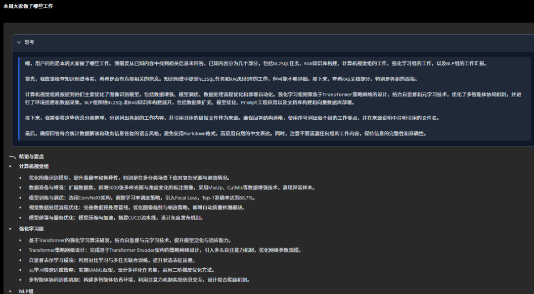 让我们看看问答效果吧。我们录入了脱敏的工作周报,首先我询问整体的情况。这个比较适合领导看,因为所有组的周报大模型都会回答而且模型会筛选出重点数据。由于是全局不标注来源,因为来源可能很多。细节问题会标注,这个完了会测试细节问题。